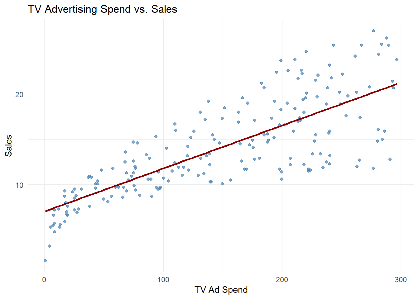 rename(tv = 2)To examine each channel’s effect on sales in more detail, I plotted sales against each advertising channel (TV, newspaper, and radio) with a linear trend line. All three channels’ ad spend displayed a positive, linear correlation with sales. However, the strength of the correlation varied among the three.