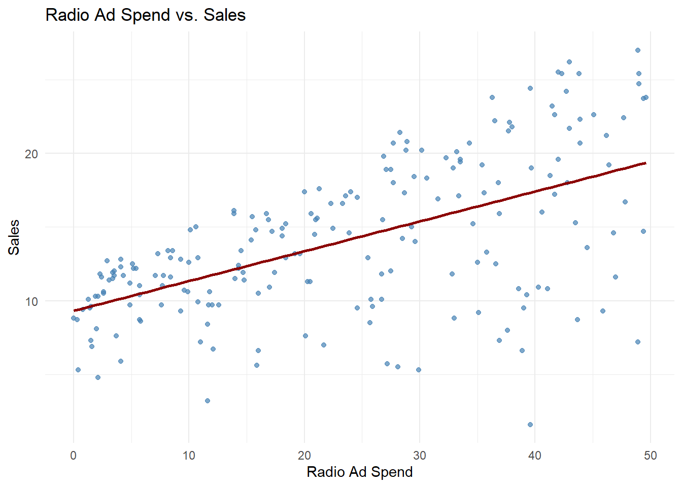 Radio, while still positively associated with sales, shows a weaker relationship, with an R² of 0.332. This suggests that radio spend accounts for roughly a third of the variation in sales on its own, pointing to a less consistent and more variable influence compared to TV.