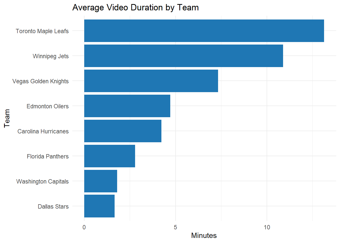 The Toronto Maple Leafs produced the longest videos on average, approaching 13 minutes per upload, well above the rest of the league. The Winnipeg Jets and Vegas Golden Knights followed with moderately long content. In contrast, teams like the Dallas Stars, Washington Capitals, and Florida Panthers maintained much shorter average durations, indicating a strategy focused on quick-hit content.