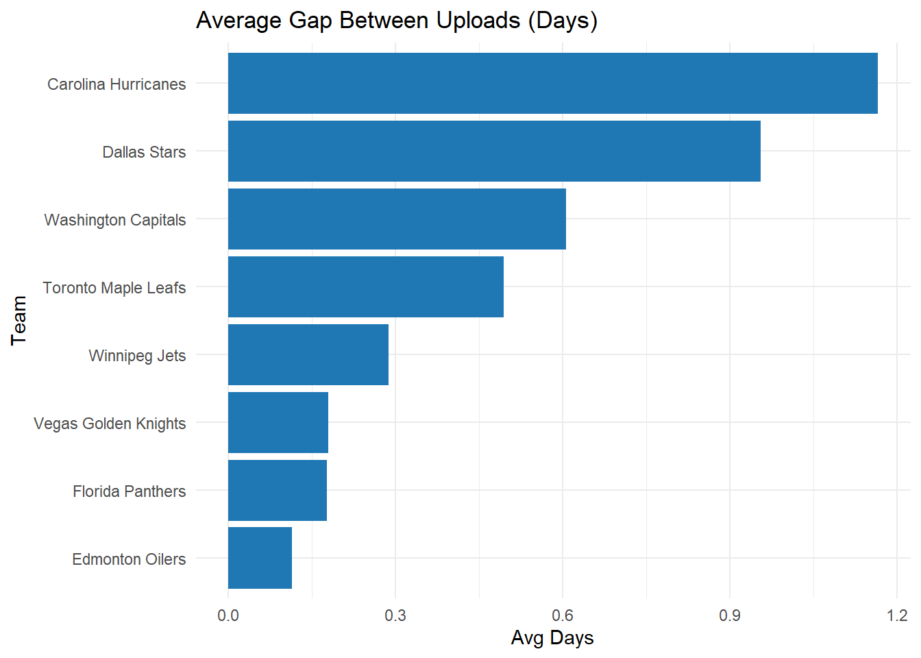 The Carolina Hurricanes and Dallas Stars posted the least frequently, with average gaps of roughly a day between uploads. Meanwhile, the Edmonton Oilers posted much more often, with intervals well under half a day, indicating a high-volume content push. Teams like the Panthers, Golden Knights, and Jets also showed relatively consistent upload pacing.