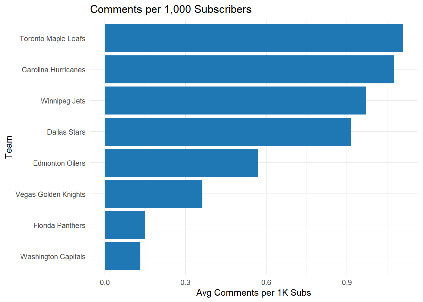 The Toronto Maple Leafs and Carolina Hurricanes top the list in comments per 1K subs, each exceeding one comment per thousand, which may reflect more discussion-oriented or emotionally resonant content. Winnipeg and Dallas also perform well, mirroring their success in the likes chart. In contrast, the Florida Panthers and Washington Capitals show weaker performance in comment engagement, despite higher subscriber counts, pointing to a possible gap in content that sparks interaction.
