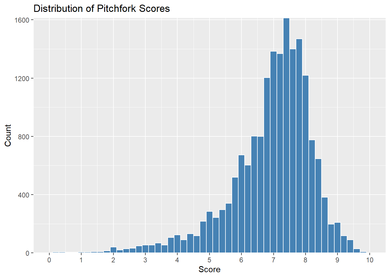 ggplot(merged, aes(x = score)) +geom_histogram(binwidth =0.2, fill ="steelblue", color ="white") +scale_x_continuous(breaks =0:10, limits =c(0, 10)) +scale_y_continuous(expand =c(0, 0)) +labs(title ="Distribution of Pitchfork Scores",x ="Score",y ="Count")