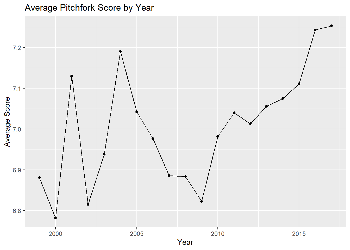 I was curious whether Pitchfork’s average scores have changed over time — are they more generous or more critical than in the past?