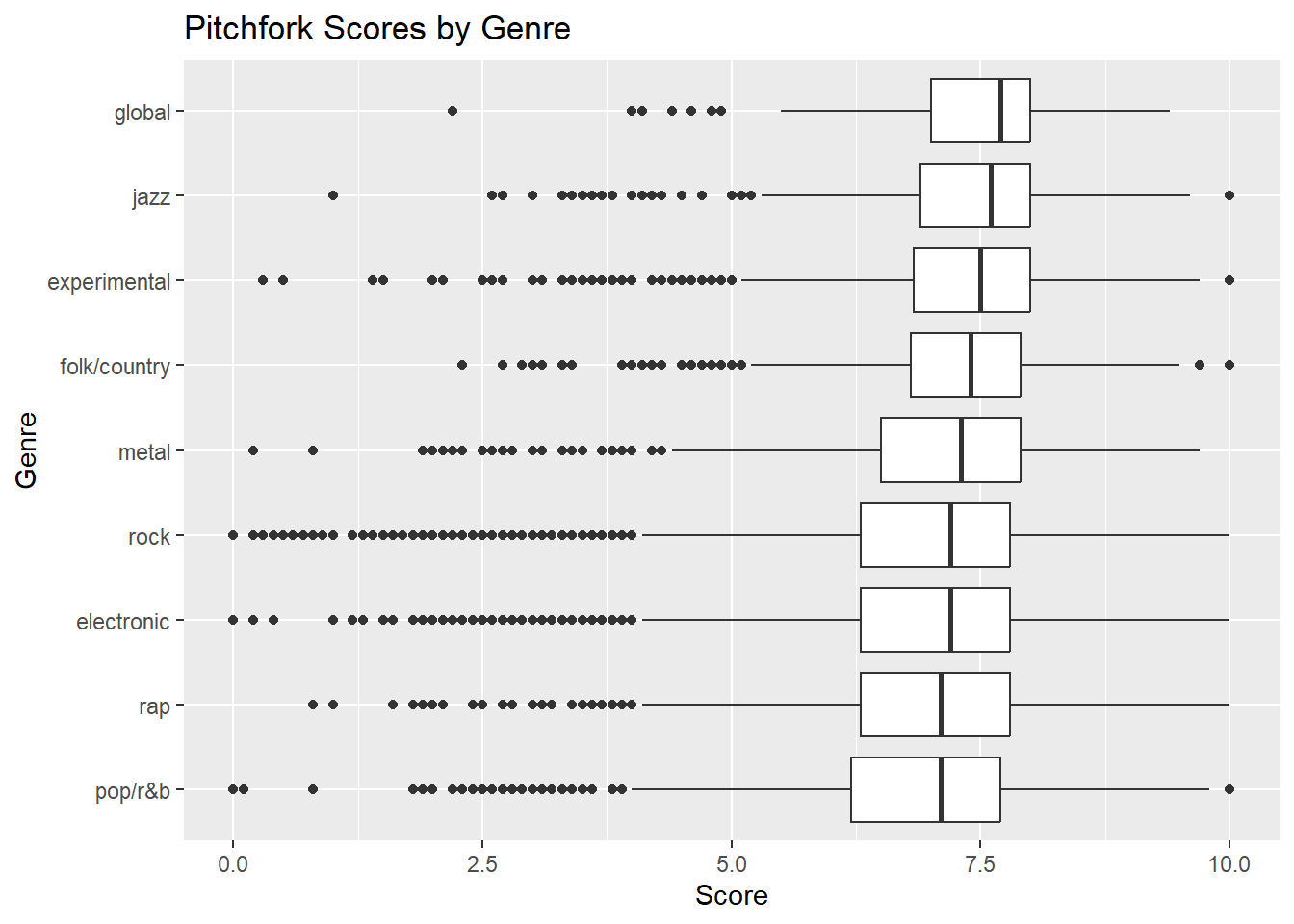 merged |>inner_join(genre, by ="reviewid") |>filter(!is.na(genre)) |>ggplot(aes(x =fct_reorder(genre, score), y = score)) +geom_boxplot() +coord_flip() +labs(title ="Pitchfork Scores by Genre", x ="Genre", y ="Score")